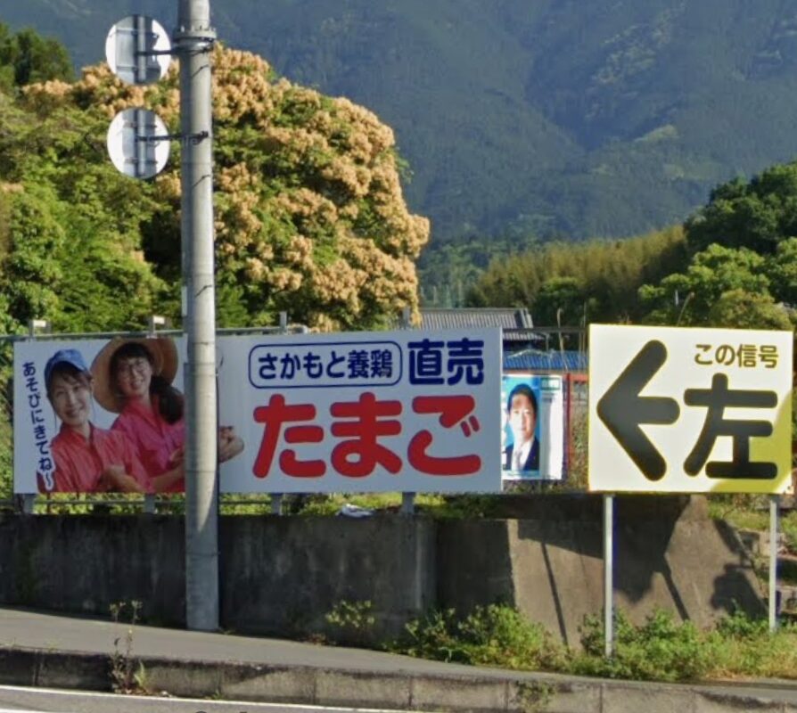 (2)「さかもと養鶏」の大きな看板で「左折」