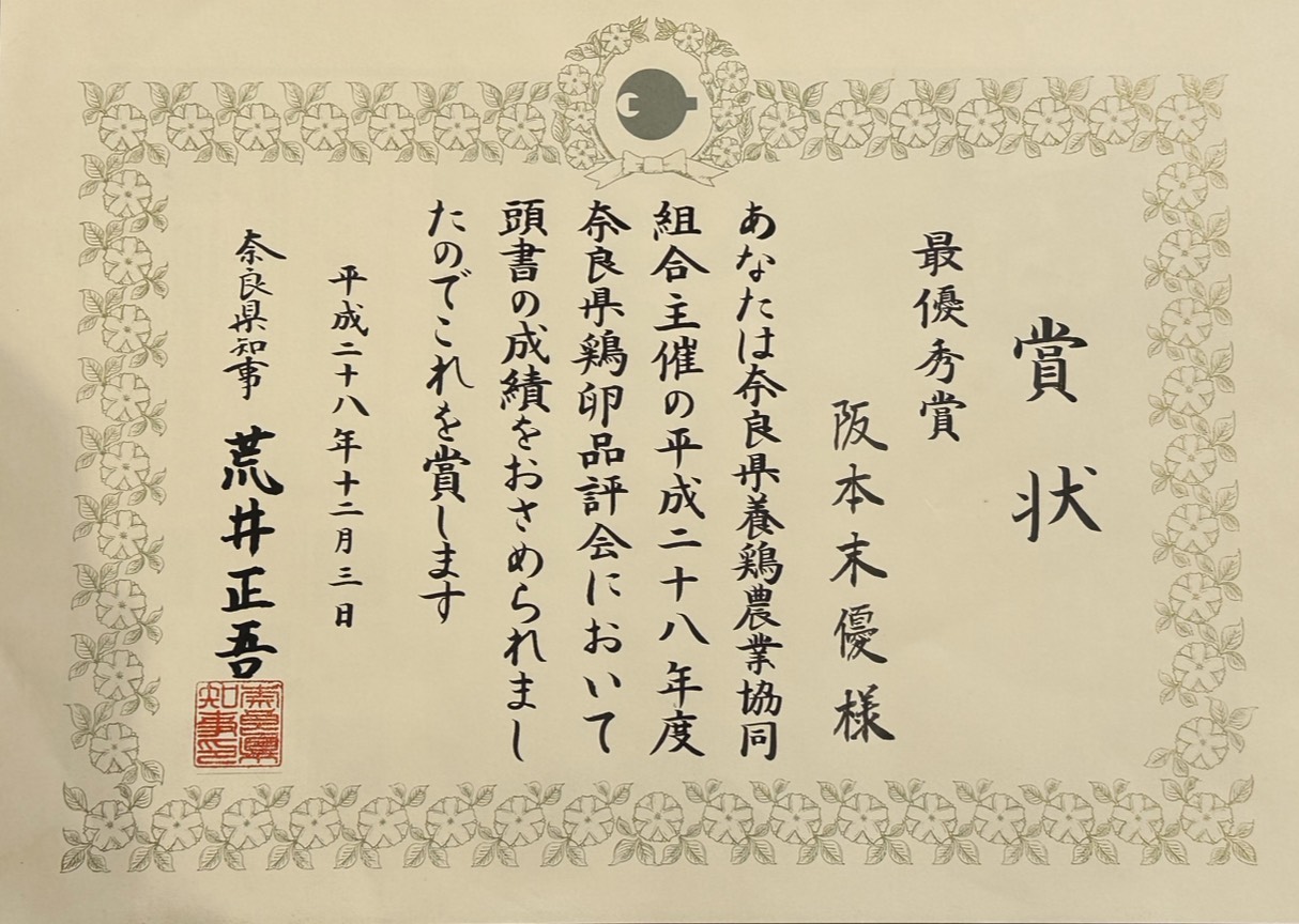 奈良県鶏卵品評会において「最優秀賞」を受賞いたしました。